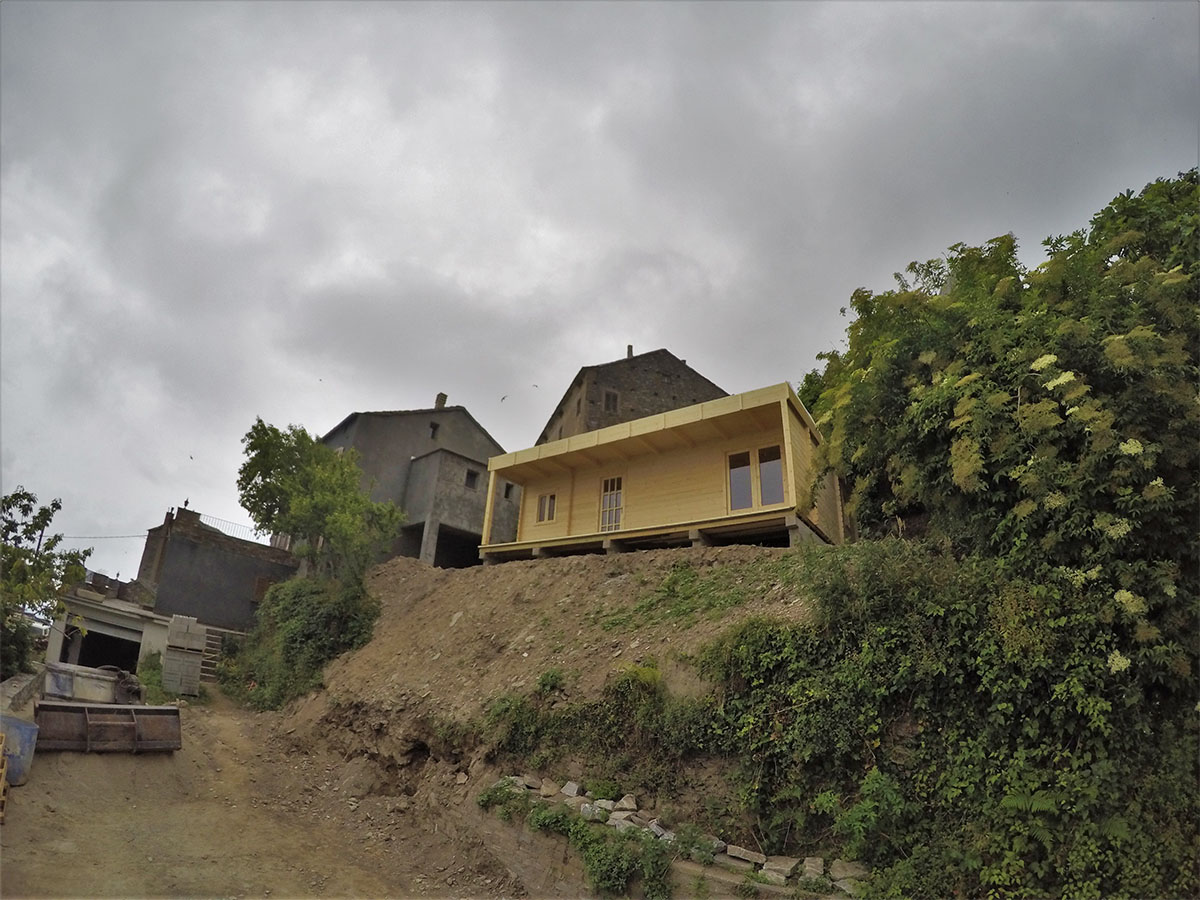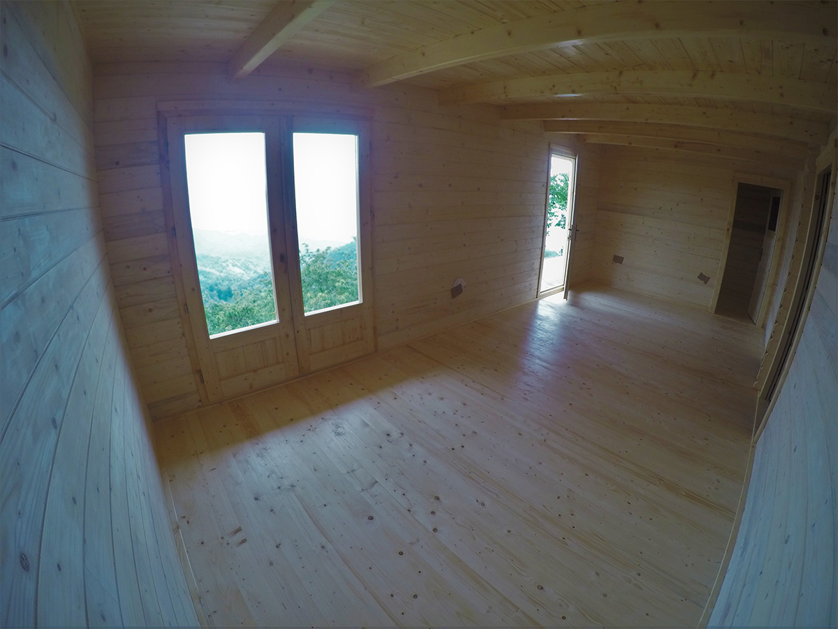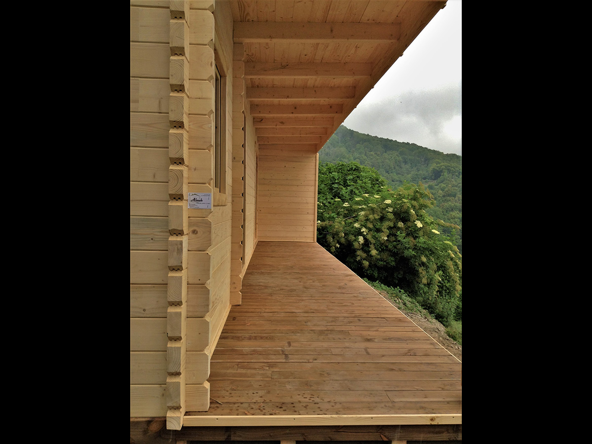 Casă mică din lemn, o altfel de casă de vacanță construită într-o zonă de munte, pe un teren limitat ca suprafață, unde peisajul se deschide către Marea Mediterană. Living-ul, bucătăria și locul pentru servit masa, sunt unite într-un open-space și orientate spre mica terasă deschisă către peisaj. Pe aceeași întindere parter mai regăsim o baie și două dormitoare.