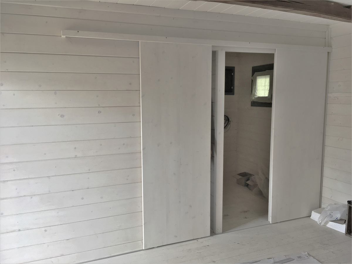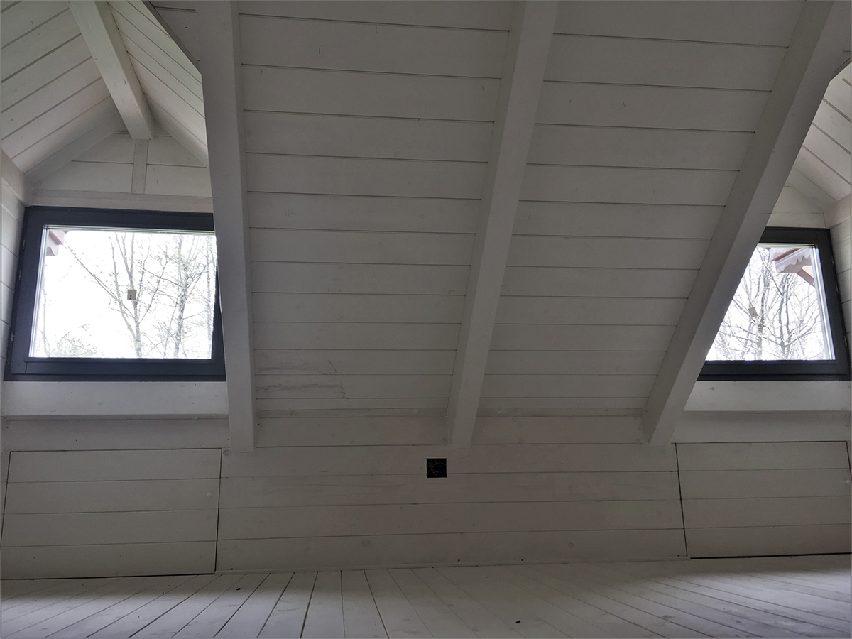 Casa din lemn finisata cu lambriu pin vopsit alb cu textura vizibila