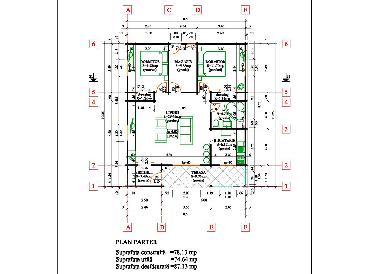 Casa este proiectată pe un singur nivel, având o compartimentare practică și echilibrată, care maximizează funcționalitatea fiecărei zone. Accesul se face printr-un vestibul de 3,4 m², care asigură tranziția confortabilă între exterior și interior. Bucătăria deschisă, cu o suprafață de 6,12 m², este amplasată în legătură directă cu zona de living și dining de 29,5 m², formând un spațiu amplu, luminos și perfect pentru activitățile zilnice și socializarea în familie.