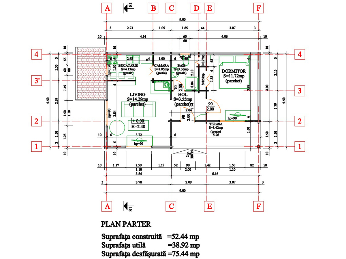 Acest proiect de casă din lemn, cu un design minimalist, oferă o soluție ingenioasă pentru o casă de vacanță sau ca o anexă în grădină ta. Având o suprafață construită de 49,5 mp și una utilă de 38,92 mp, spațiile interioare sunt concepute cu grijă pentru a asigura confort și funcționalitate. La intrare, un hol de 3,55 mp te întâmpină, oferind un sentiment de căldură și deschidere. Livingul generos de 14,29 mp devine inima casei, perfect pentru întâlniri cu familia sau prietenii, iar bucătăria de 4,13 mp, eficient organizată, încurajează gătitul și socializarea. Cămara de 1,05 mp completează spațiul, asigurând că toate ingredientele sunt la îndemână, fără a aglomera suprafețele de lucru. Baia compactă, având o suprafață de 3,36 mp, dispune de spațiul necesar pentru a fi utilată corespunzător, iar dormitorul generos de 11,72 mp oferă un refugiu intim, ideal pentru odihnă. O terasa de 8,42 mp extinde spațiul de locuit în aer liber, creând un loc minunat pentru a savura cafeaua de dimineața.