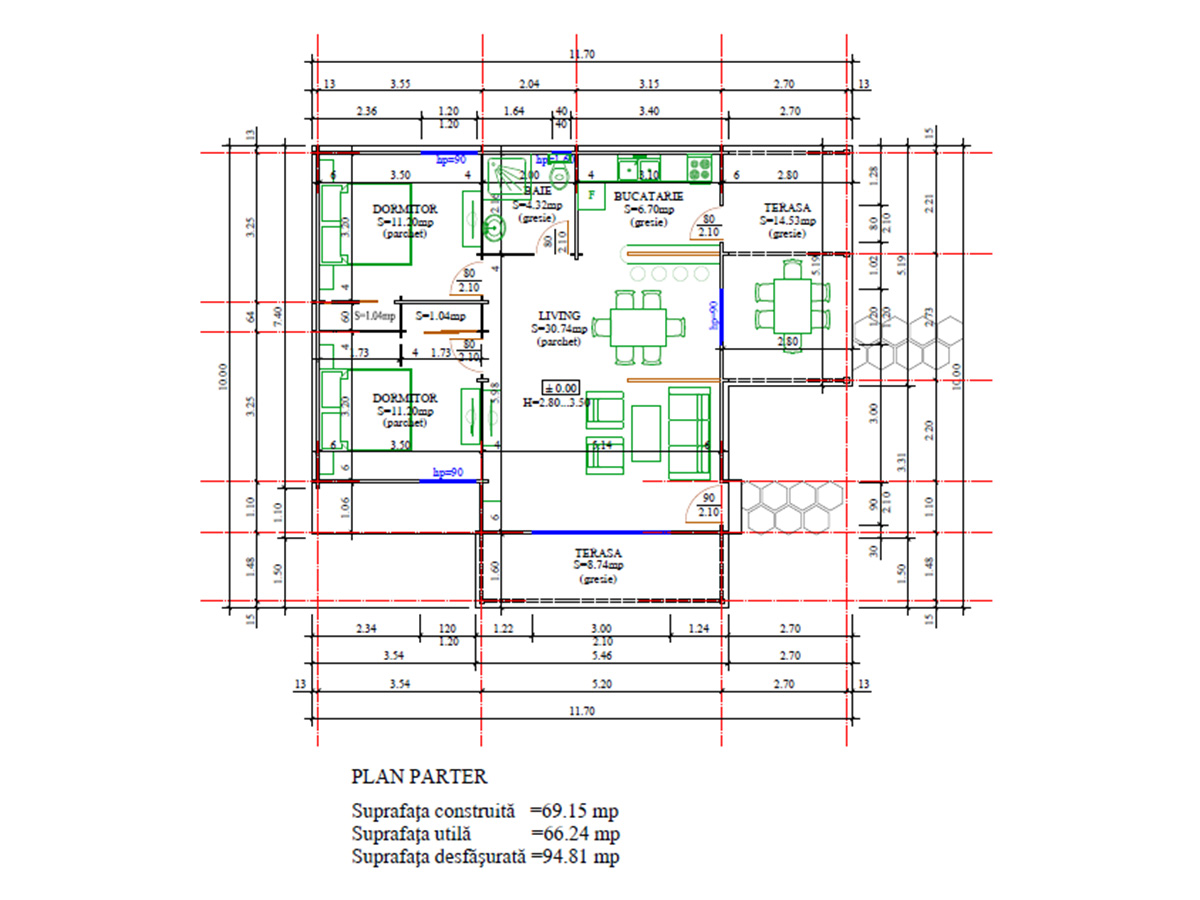 Acest model de casa din lemn curpinde o suprafață construită totală de 112,78 mp și o suprafață utilă interioară de 66,24 mp. Spațiile sunt atent gândite, oferind un living spațios de 30,74 mp, care include și zona de dining, o bucătărie deschisă de 6,70 mp, și o baie compactă de 4,32 mp. Locuința include două dormitoare identice, fiecare de 11,20 mp, cu spațiu dedicat pentru dressing. Cele două terase, de 14,53 mp și 8,74 mp, extind zona de relaxare spre exterior, creând un ambient plăcut pentru timpul petrecut în aer liber. Acest proiect combină estetica tradițională cu avantajele unei locuințe moderne, eficiente din punct de vedere energetic.